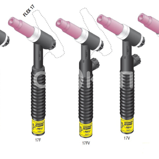 Ключевой особенностью серии является модульная конструкция, предлагающая множество вариантов исполнения: стандартная или гибкая головка (F), наличие встроенного клапана управления газом (V), а также выбор типа кабеля — стандартный резиновый (R) или ультрагибкий «флекс» (PF). Это позволяет точно подобрать конфигурацию под конкретные задачи и условия работы. Горелка совместима с источниками питания Miller Electric (Syncrowave, Dynasty, Maxstar) через переходные адаптеры (194722, 195378).